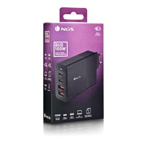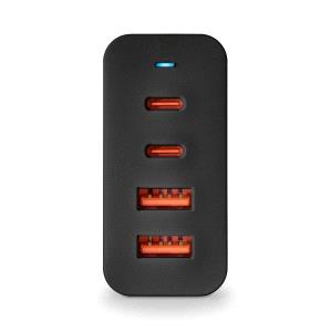 Cargador GaN de pared con 2 salidas USB-C (PD & PPS) y 2 salidas USB-A QC 3.0 de 100W de potencia máxima para cargar dispositivos de manera rápida y eficiente.