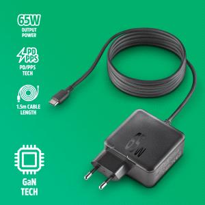 Cargador de pared con salida USB-C de 65W de potencia máxima.