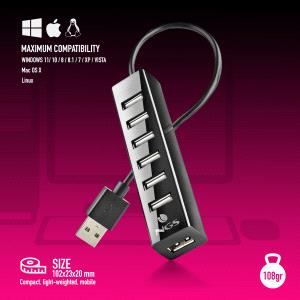 El Hub está diseñado para añadir 7 puertos USB 2.0 a cualquier dispositivo (laptop, consola, Macbook, impresora, pendrive, ratón, teclado, etc) que incluya puerto USB A, utilizando un único puerto USB.