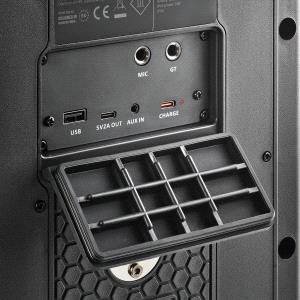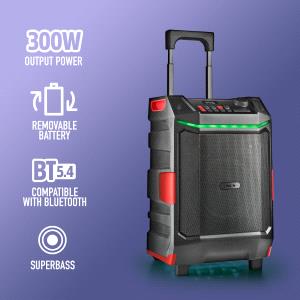 Tamaño compacto y portátil (incluye ruedas y trolley), proporciona sonido de alta calidad gracias a su gran potencia de salida, 50W RMS.